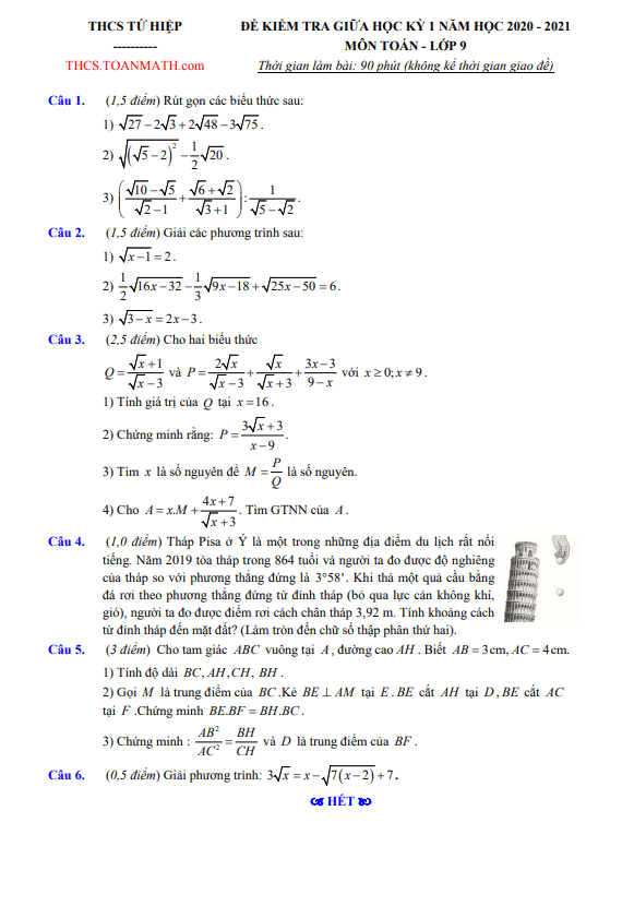Đề Thi Giữa HK1 Toán 9 Đề thi giữa kì 1 Toán 9 năm 2020 – 2021 trường THCS Tứ Hiệp – Hà Nội 09/12/2020