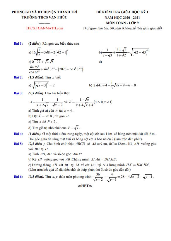 Đề Thi Giữa HK1 Toán 9 Đề thi giữa kì 1 Toán 9 năm 2020 – 2021 trường THCS Vạn Phúc – Hà Nội 09/12/2020