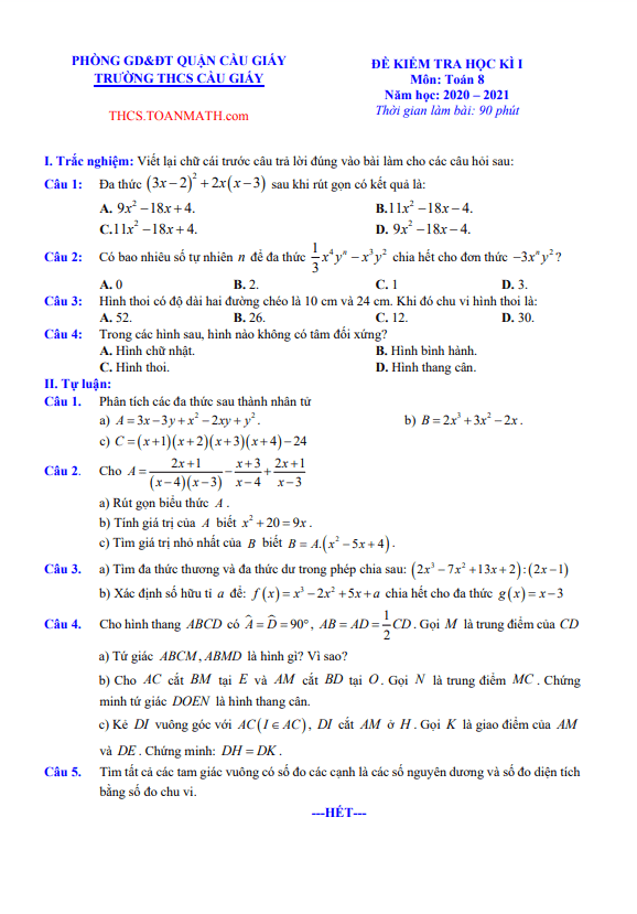 Đề Thi HK1 Toán 8 Đề thi học kì 1 Toán 8 năm 2020 – 2021 trường THCS Archimedes Academy – Hà Nội 02/12/2020