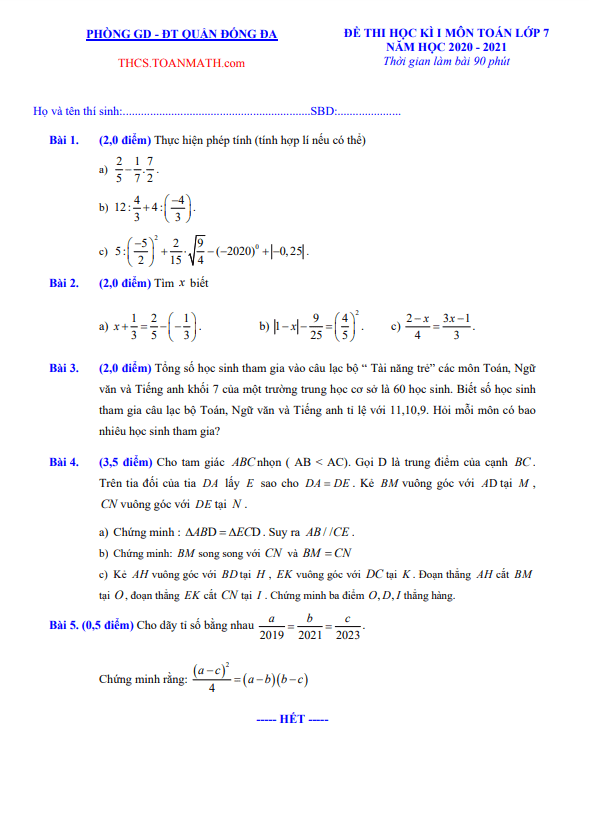 Đề Thi HK1 Toán 7 Đề thi học kì 1 Toán 7 năm 2020 – 2021 trường THCS Nguyễn Công Trứ – Hà Nội 01/12/2020