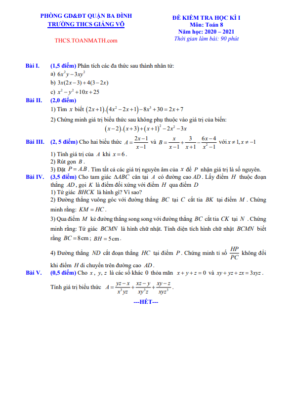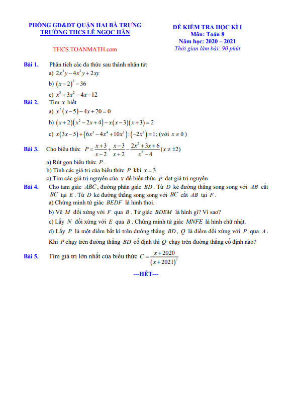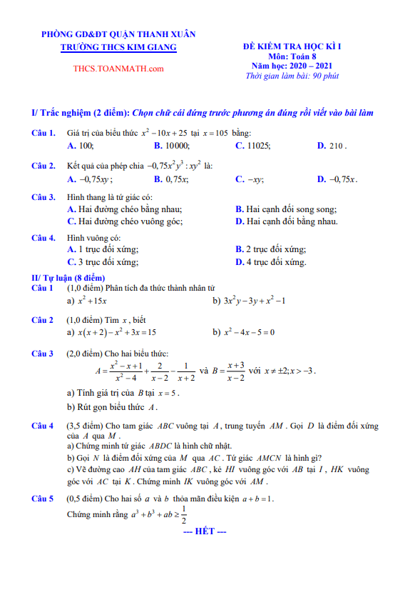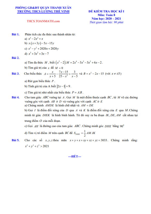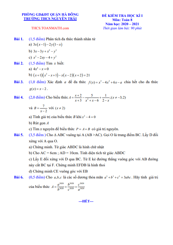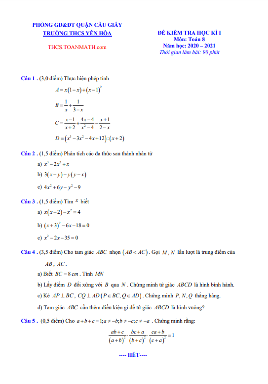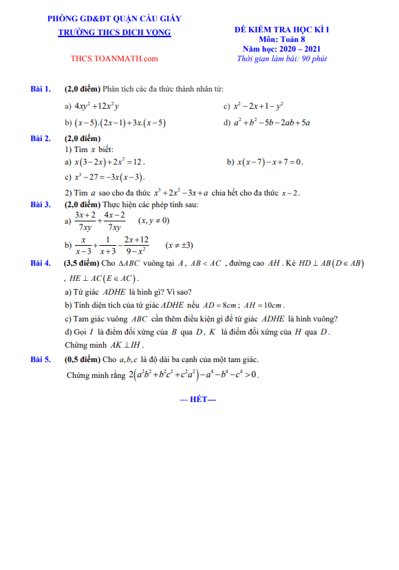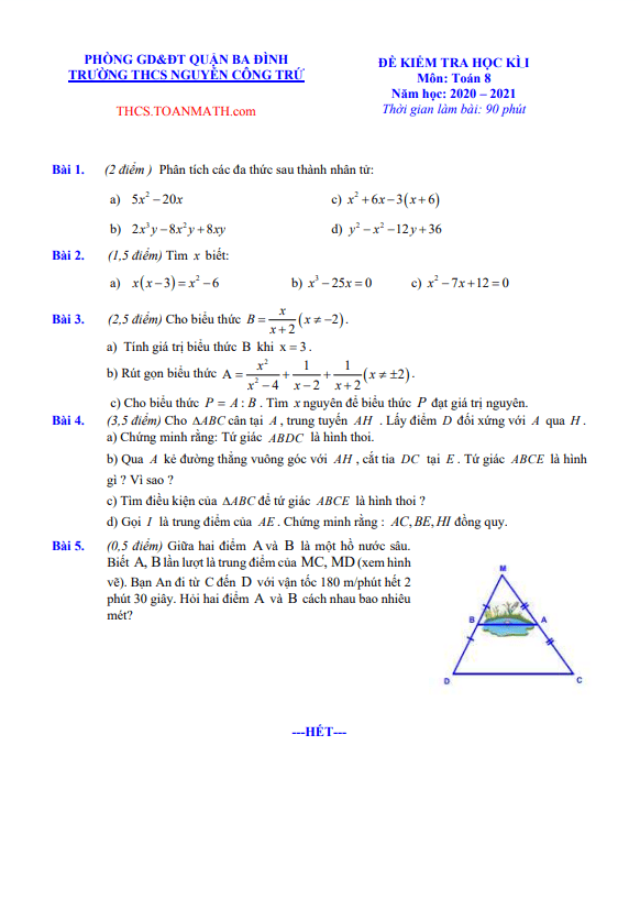 Đề Thi HK1 Toán 8 Đề thi học kì 1 Toán 8 năm 2020 – 2021 trường THCS Nguyễn Công Trứ – Hà Nội 02/12/2020