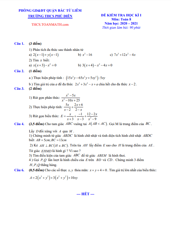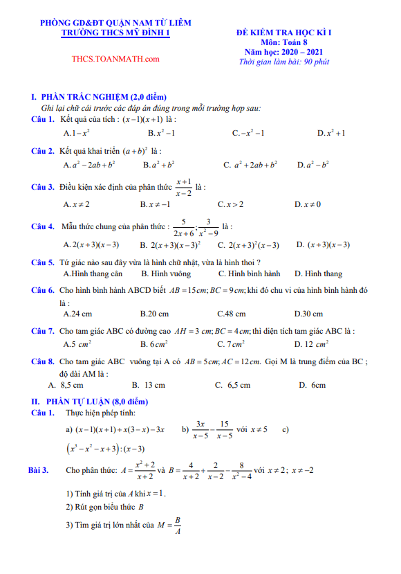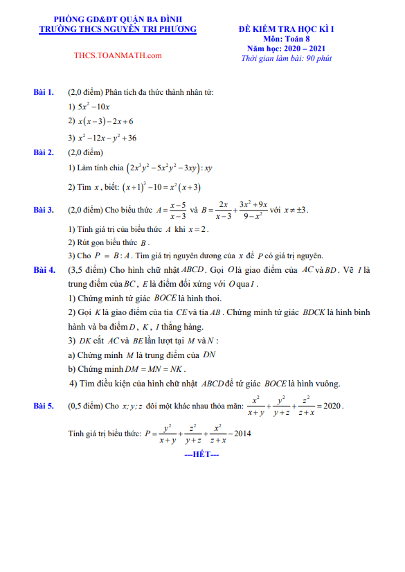 Đề Thi HK1 Toán 8 Đề thi học kì 1 Toán 8 năm 2020 – 2021 trường THCS Nguyễn Tri Phương – Hà Nội 02/12/2020
