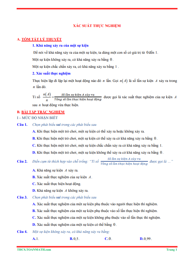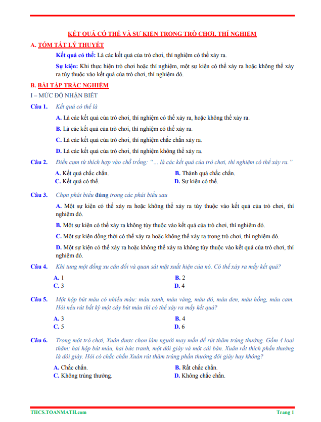 Tài Liệu Toán 6 Tóm tắt lý thuyết và bài tập trắc nghiệm kết quả có thể và sự kiện trong trò chơi, thí nghiệm 30/10/2021