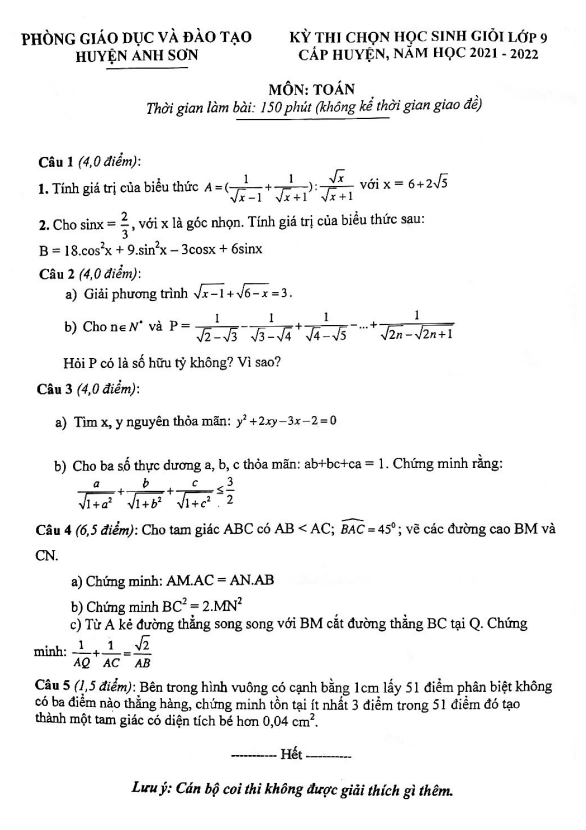 Đề Thi HSG Toán 9 Đề chọn học sinh giỏi Toán 9 năm 2021 – 2022 phòng GD&ĐT Anh Sơn – Nghệ An 11/11/2021