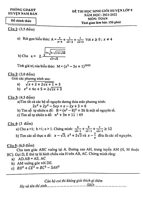Đề Thi HSG Toán 9 Đề học sinh giỏi huyện Toán 9 năm 2021 – 2022 phòng GD&ĐT Nam Đàn – Nghệ An 13/11/2021