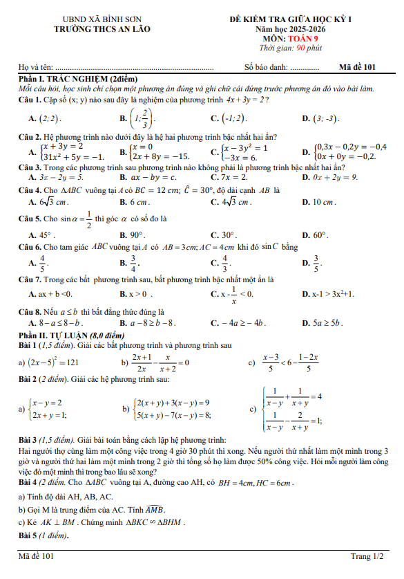 1. Trong một tam giác vuông, mỗi cạnh góc vuông bằng: