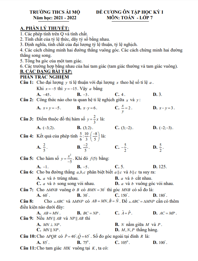 Đề Cương Ôn Tập Toán 7 Đề cương ôn tập học kỳ 1 Toán 7 năm 2021 – 2022 trường THCS Ái Mộ – Hà Nội 25/12/2021
