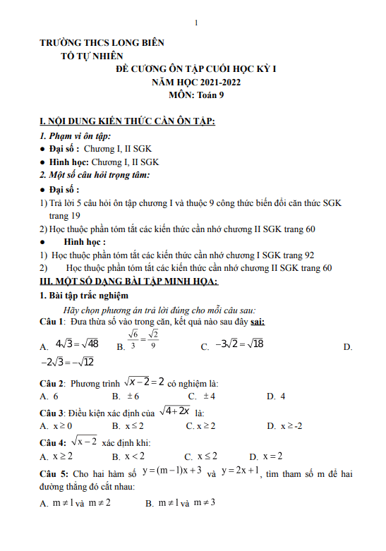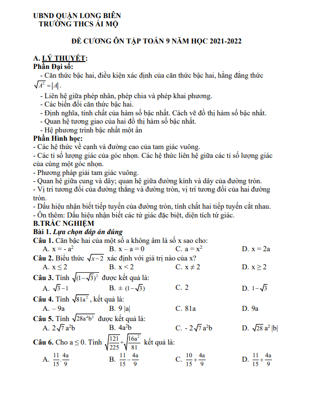 Đề Cương Ôn Tập Toán 9 Ôn tập cuối học kỳ 1 Toán 9 năm 2021 – 2022 trường THCS Long Biên – Hà Nội 16/12/2021