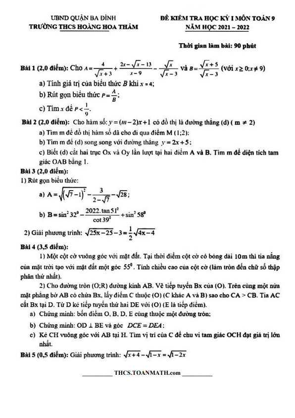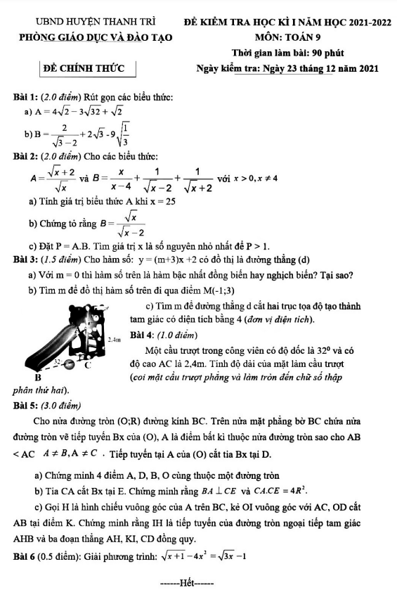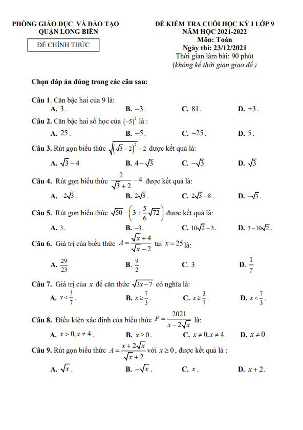 Đề Thi HK1 Toán 9 Đề kiểm tra cuối học kì 1 Toán 9 năm 2021 – 2022 phòng GD&ĐT Long Biên – Hà Nội 24/12/2021
