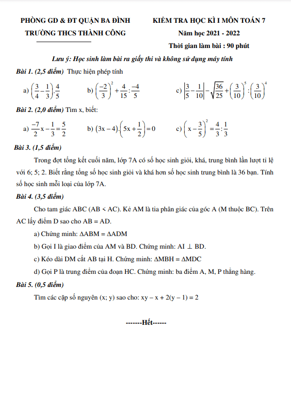 Đề Thi HK1 Toán 7 Đề kiểm tra học kì 1 Toán 7 năm 2021 – 2022 trường THCS Thành Công – Hà Nội 25/12/2021