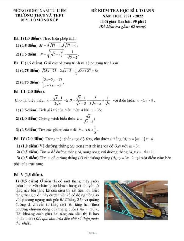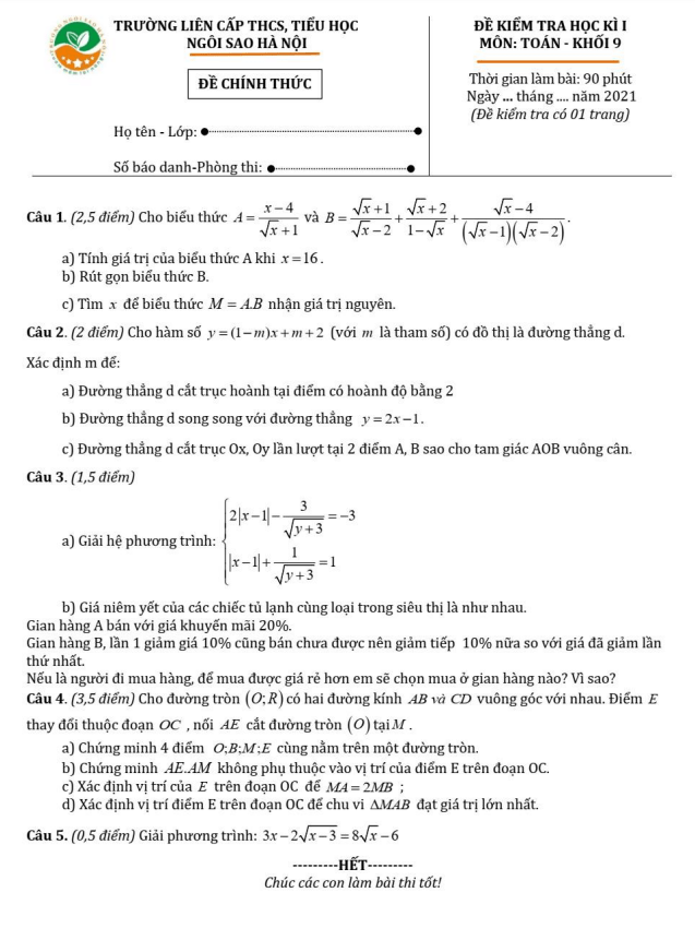 Đề Thi HK1 Toán 9 Đề kiểm tra học kì 1 Toán 9 năm 2021 – 2022 trường TH&THCS Ngôi Sao Hà Nội 25/12/2021