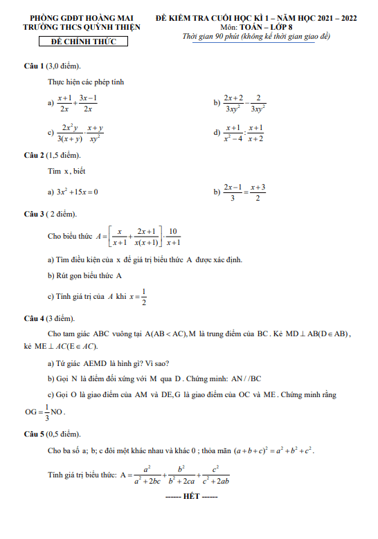 Đề Thi HK1 Toán 8 Đề thi cuối học kì 1 Toán 8 năm 2021 – 2022 trường THCS Quỳnh Thiện – Hà Nội 25/12/2021