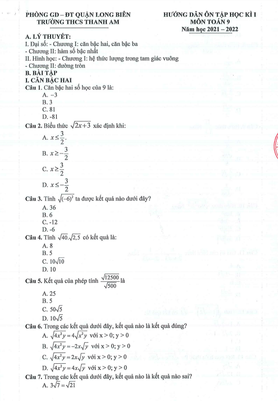 Đề Cương Ôn Tập Toán 9 Hướng dẫn ôn tập học kì 1 Toán 9 năm 2021 – 2022 trường THCS Thanh Am – Hà Nội 16/12/2021