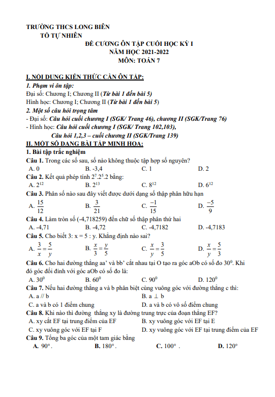 Đề Cương Ôn Tập Toán 7 Ôn tập cuối học kỳ 1 Toán 7 năm 2021 – 2022 trường THCS Long Biên – Hà Nội 16/12/2021