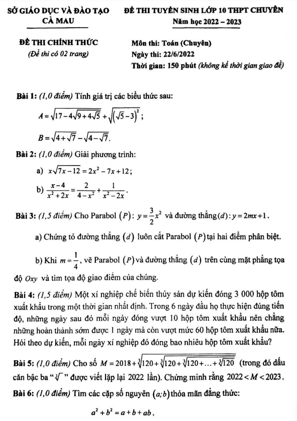 Đề Thi Tuyển Sinh Lớp 10 Môn Toán Đề tuyển sinh lớp 10 chuyên môn Toán (chuyên) năm 2022 – 2023 sở GD&ĐT Cà Mau 24/06/2022