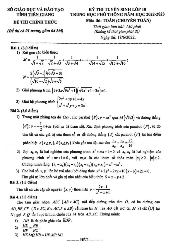 Đề Thi Tuyển Sinh Lớp 10 Môn Toán Đề tuyển sinh lớp 10 môn Toán (chuyên Toán) năm 2022 – 2023 sở GD&ĐT Tiền Giang 24/06/2022