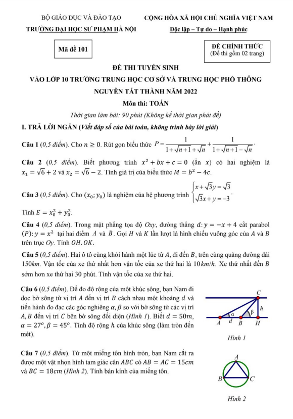 Đề Thi Tuyển Sinh Lớp 10 Môn Toán Đề tuyển sinh lớp 10 môn Toán năm 2022 trường Nguyễn Tất Thành – Hà Nội 26/06/2022