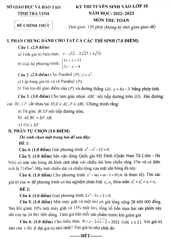 Đề Thi Tuyển Sinh Lớp 10 Môn Toán Đề tuyển sinh vào lớp 10 môn Toán năm 2022 – 2023 sở GD&ĐT Trà Vinh 23/06/2022