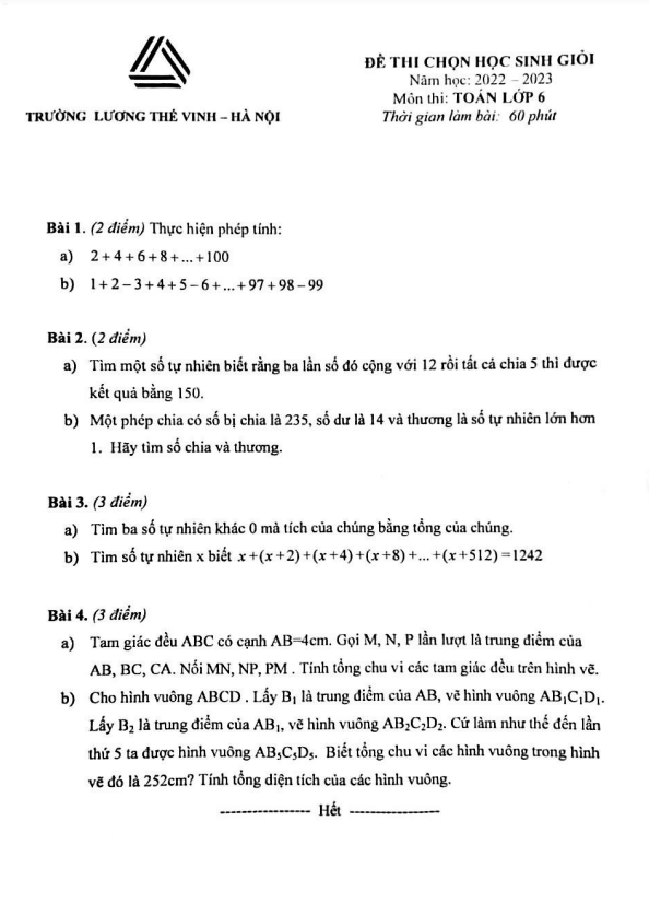 Đề Thi HSG Toán 6 Đề chọn học sinh giỏi Toán 6 năm 2022 – 2023 trường Lương Thế Vinh – Hà Nội 07/09/2022