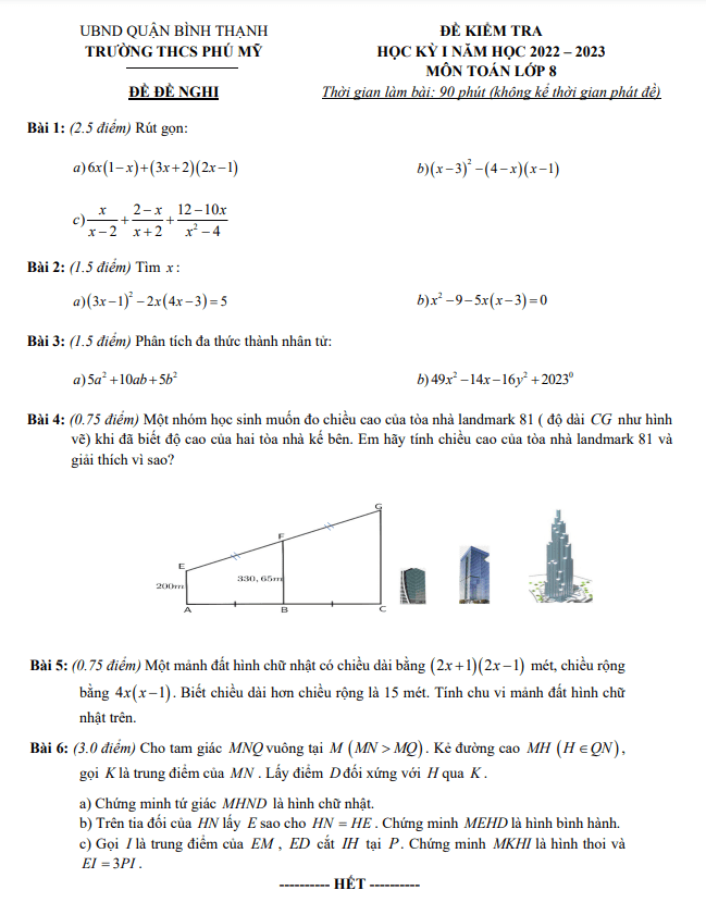 Đề Thi HK1 Toán 9 Đề tham khảo cuối kỳ 1 Toán 9 năm 2022 – 2023 trường THCS Phú Mỹ – TP HCM 25/11/2022