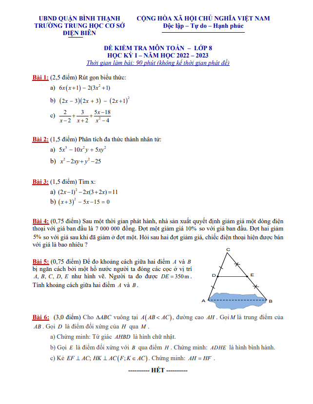 Đề Thi HK1 Toán 8 Đề tham khảo cuối kỳ 1 Toán 8 năm 2022 – 2023 trường THCS Điện Biên – TP HCM 25/11/2022