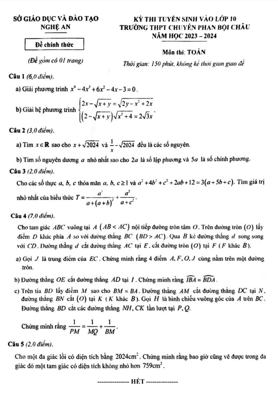 Đề thi vào lớp 10 môn Toán năm 2023 – 2024 trường chuyên Phan Bội Châu – Nghệ An