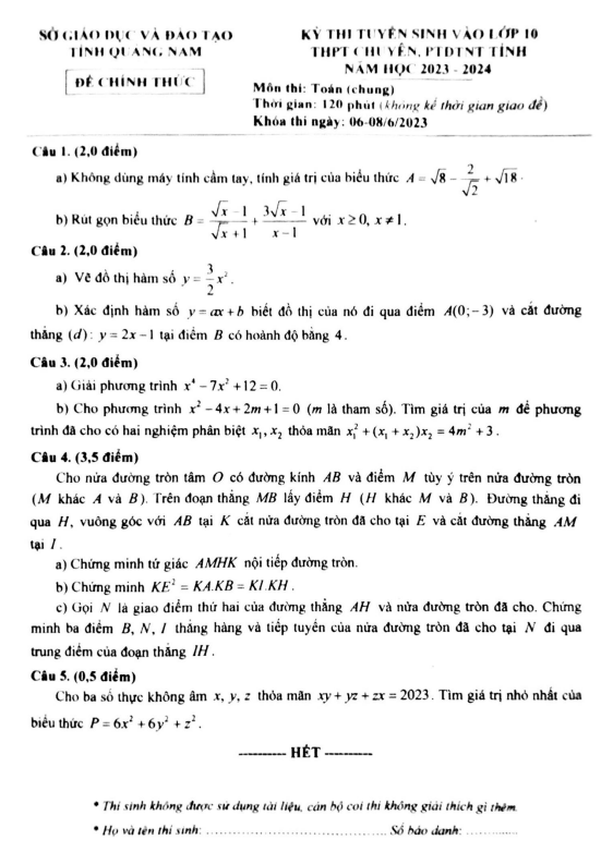 Đề tuyển sinh lớp 10 chuyên môn Toán (chung) năm 2023 – 2024 sở GD&ĐT Quảng Nam