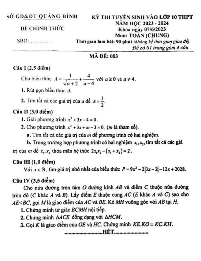 Đề tuyển sinh lớp 10 môn Toán (chung) năm 2023 – 2024 sở GD&ĐT Quảng Bình