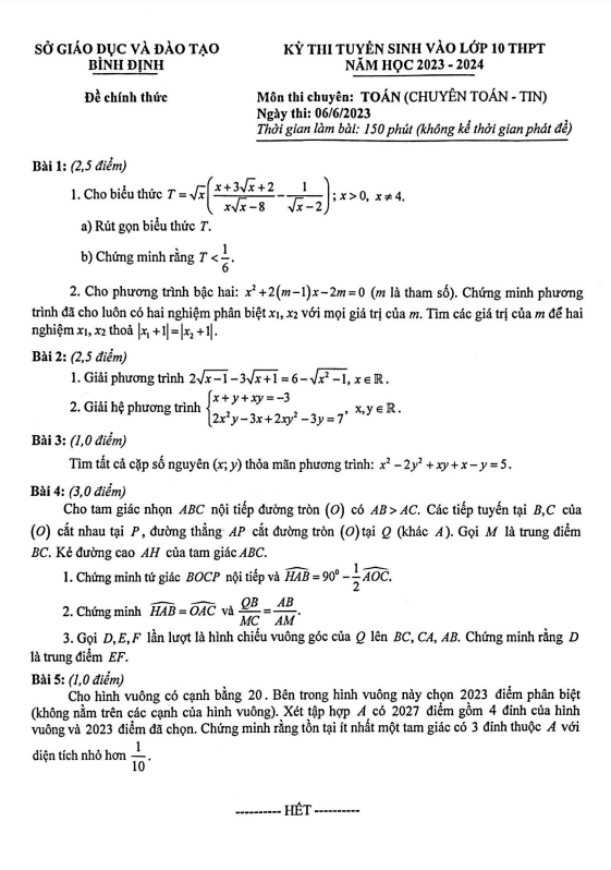 Đề tuyển sinh lớp 10 môn Toán (chuyên) năm 2023 – 2024 sở GD&ĐT Bình Định