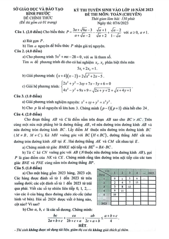 Đề tuyển sinh lớp 10 môn Toán (chuyên) năm 2023 – 2024 sở GD&ĐT Bình Phước