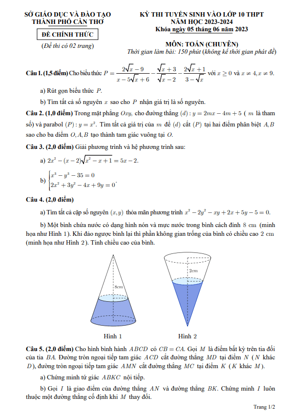 Đề tuyển sinh lớp 10 môn Toán (chuyên) năm 2023 – 2024 sở GD&ĐT Cần Thơ
