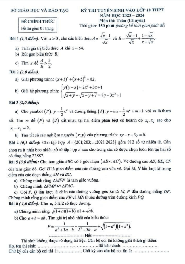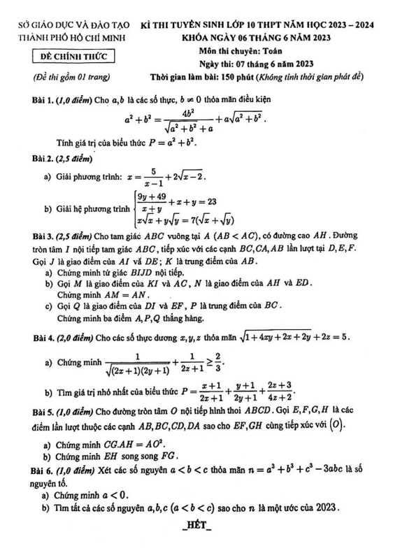 Đề tuyển sinh lớp 10 môn Toán (chuyên) năm 2023 – 2024 sở GD&ĐT TP Hồ Chí Minh
