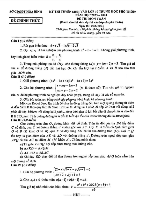 Đề tuyển sinh lớp 10 môn Toán (chuyên) năm 2023 – 2024 sở GD&ĐT Hòa Bình