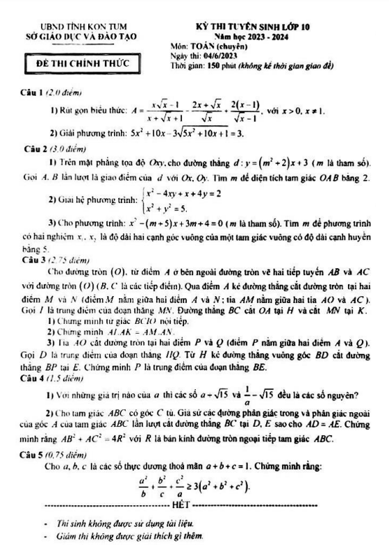 Đề tuyển sinh lớp 10 môn Toán (chuyên) năm 2023 – 2024 sở GD&ĐT Kon Tum