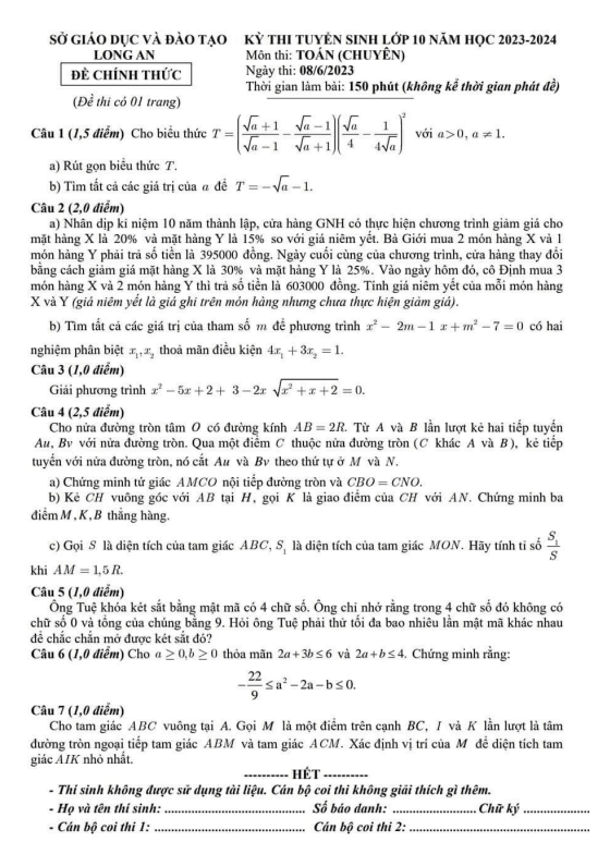 Đề tuyển sinh lớp 10 môn Toán (chuyên) năm 2023 – 2024 sở GD&ĐT Long An