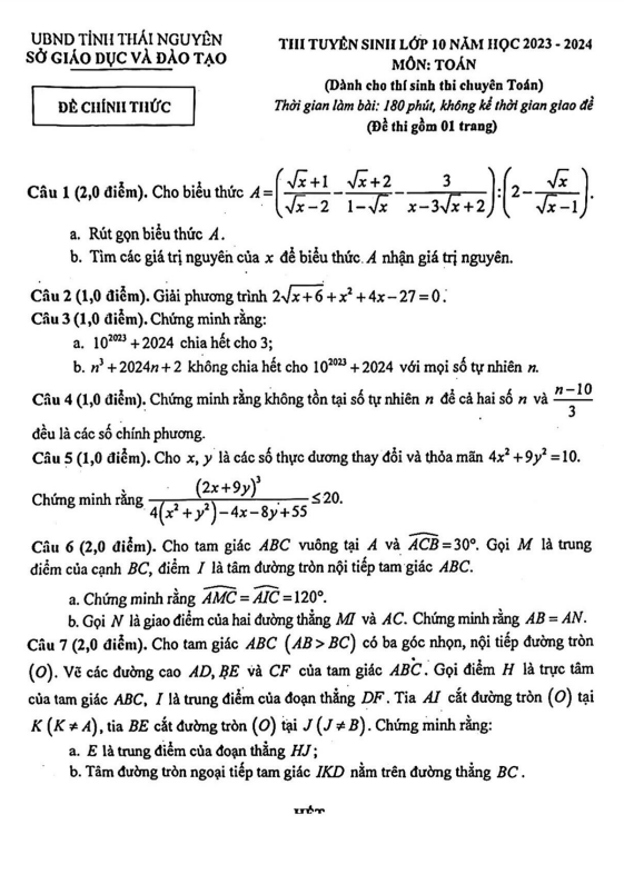Đề tuyển sinh lớp 10 môn Toán (chuyên) năm 2023 – 2024 sở GD&ĐT Thái Nguyên