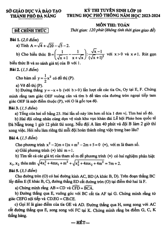 Đề tuyển sinh lớp 10 môn Toán năm 2023 – 2024 sở GD&ĐT Đà Nẵng