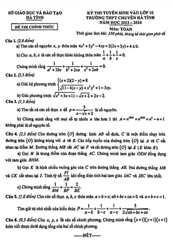 Đề tuyển sinh lớp 10 môn Toán năm 2023 – 2024 trường THPT chuyên Hà Tĩnh
