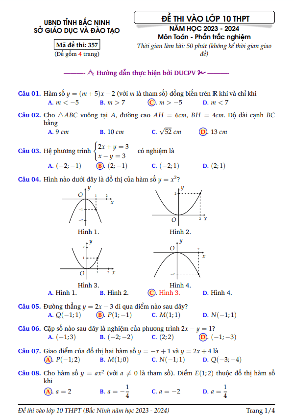Đề tuyển sinh vào lớp 10 môn Toán năm 2023 – 2024 sở GD&ĐT Bắc Ninh