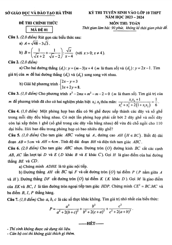 Đề tuyển sinh vào lớp 10 môn Toán năm 2023 – 2024 sở GD&ĐT Hà Tĩnh