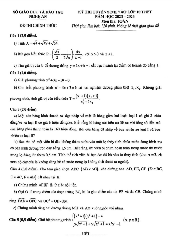 Đề tuyển sinh vào lớp 10 môn Toán năm 2023 – 2024 sở GD&ĐT Nghệ An