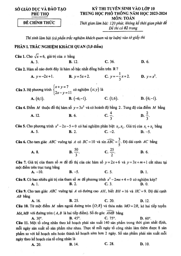 Đề tuyển sinh vào lớp 10 môn Toán năm 2023 – 2024 sở GD&ĐT Phú Thọ