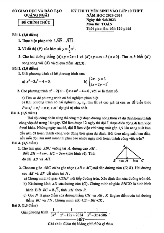 Đề tuyển sinh vào lớp 10 môn Toán năm 2023 – 2024 sở GD&ĐT Quảng Ngãi