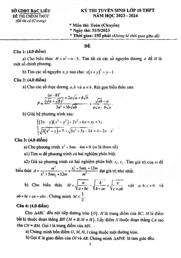 Đề Thi Tuyển Sinh Lớp 10 Môn Toán Đề tuyển sinh lớp 10 môn Toán (chuyên) năm 2023 – 2024 sở GD&ĐT Bạc Liêu 01/06/2023