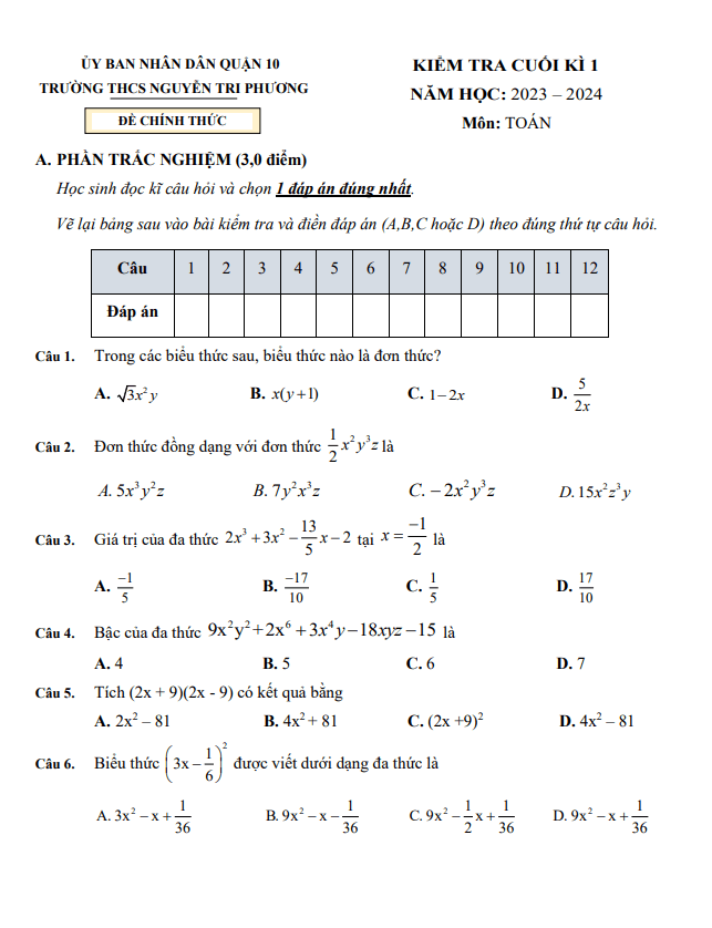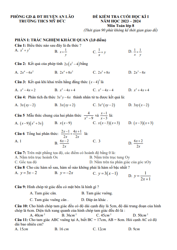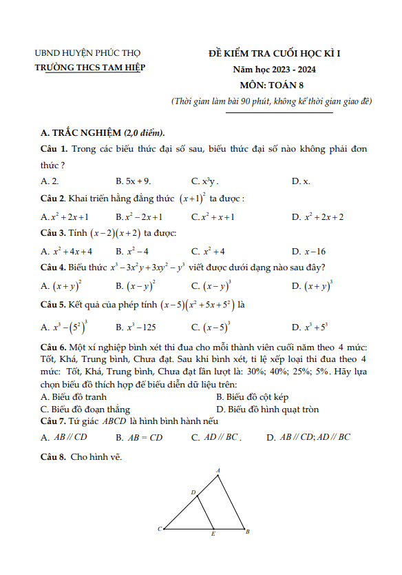 Đề Thi HK1 Toán 8 Đề cuối kỳ 1 Toán 8 năm 2023 – 2024 trường THCS Nguyễn Tri Phương – TP HCM 22/12/2023