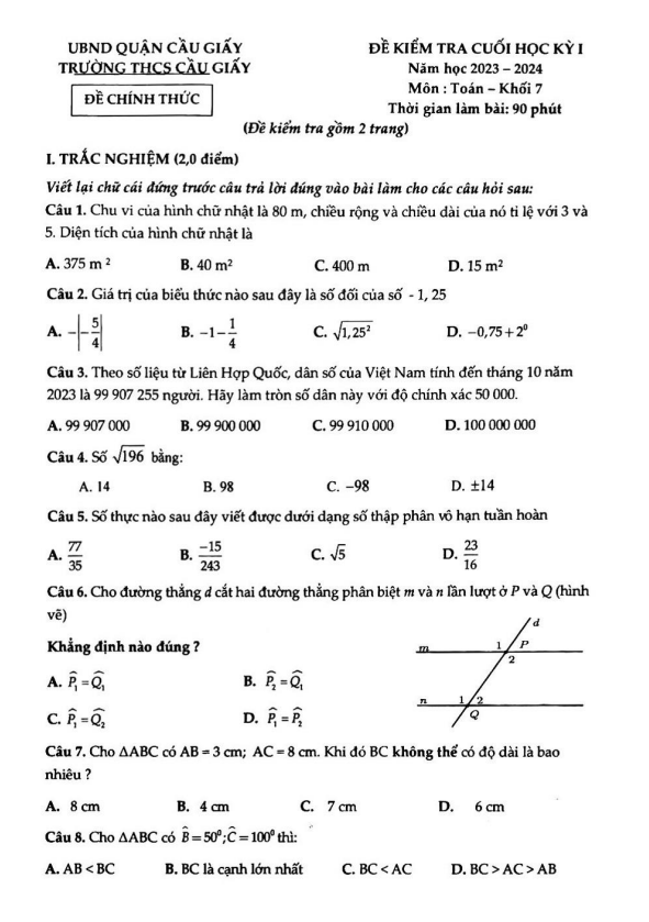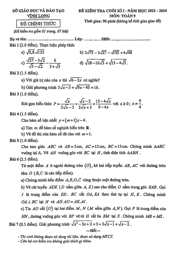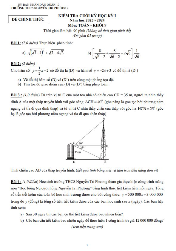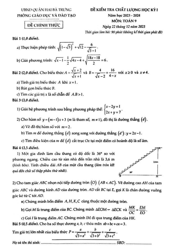 Đề Thi HK1 Toán 9 Đề cuối kỳ 1 Toán 9 năm 2023 – 2024 trường THCS Nguyễn Tri Phương – TP HCM 22/12/2023