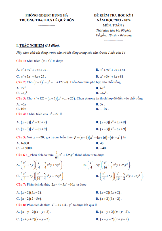 Đề Thi HK1 Toán 8 Đề cuối học kỳ 1 Toán 8 năm 2023 – 2024 trường TH&THCS Lê Quý Đôn – Thái Bình 23/12/2023
