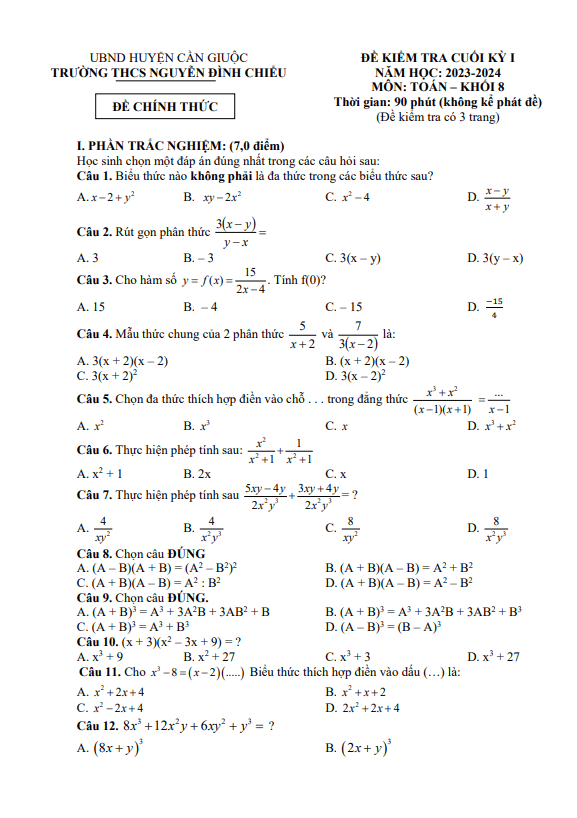 Đề Thi HK1 Toán 8 Đề cuối kỳ 1 Toán 8 năm 2023 – 2024 trường THCS Nguyễn Đình Chiểu – Long An 23/12/2023