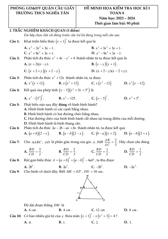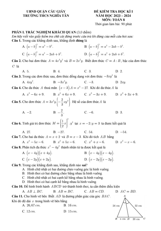Đề Thi HK1 Toán 8 Đề minh họa học kì 1 Toán 8 năm 2023 – 2024 trường THCS Nghĩa Tân – Hà Nội 21/12/2023
