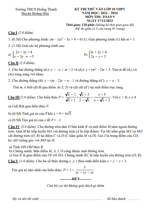Đề Thi Tuyển Sinh Lớp 10 Môn Toán Đề thi thử Toán vào lớp 10 năm 2024 trường THCS Hoằng Thanh – Thanh Hóa 21/12/2023